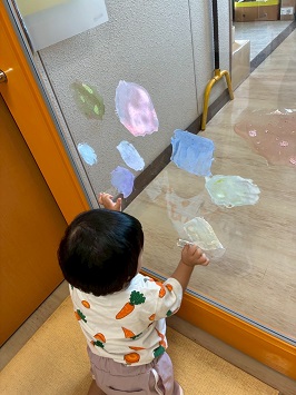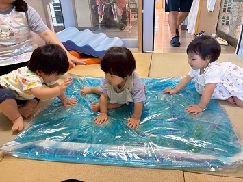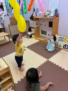 2025年09月19日(金) 9月の様子✿そら組 ①ぽっとん落としがブーム中です。何度も繰り返し楽しんでいます。 ②風船が風で揺れているのを不思議そうに見ています。 ③手作りウォーターマットが大人気です! ④色付き寒天に触れて遊びました。ぎゅっと握ったりツンツンと触れたりして感触を楽しみました。 ⑤手作りのシールにみんな興味津々です。 ⑥靴を履いて歩けるようになってとても嬉しそうです。 もどる