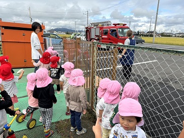 命を守る訓練で消防士さんに会え、消防車を間近で見られて大興奮!じっくり観察する中で消火器やホースを発見!あれはなに?と疑問を持ったり、興味津々でした。