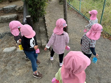 木の下にドングリを発見!!上を見上げて気にドングリがなっていることに気付いたり、葉の色の変化を楽しむ子ども達。見つけた!あった!とお散歩バッグに木の実や葉っぱを夢中になって拾い集め、秋の自然に触れ楽しんでいます。