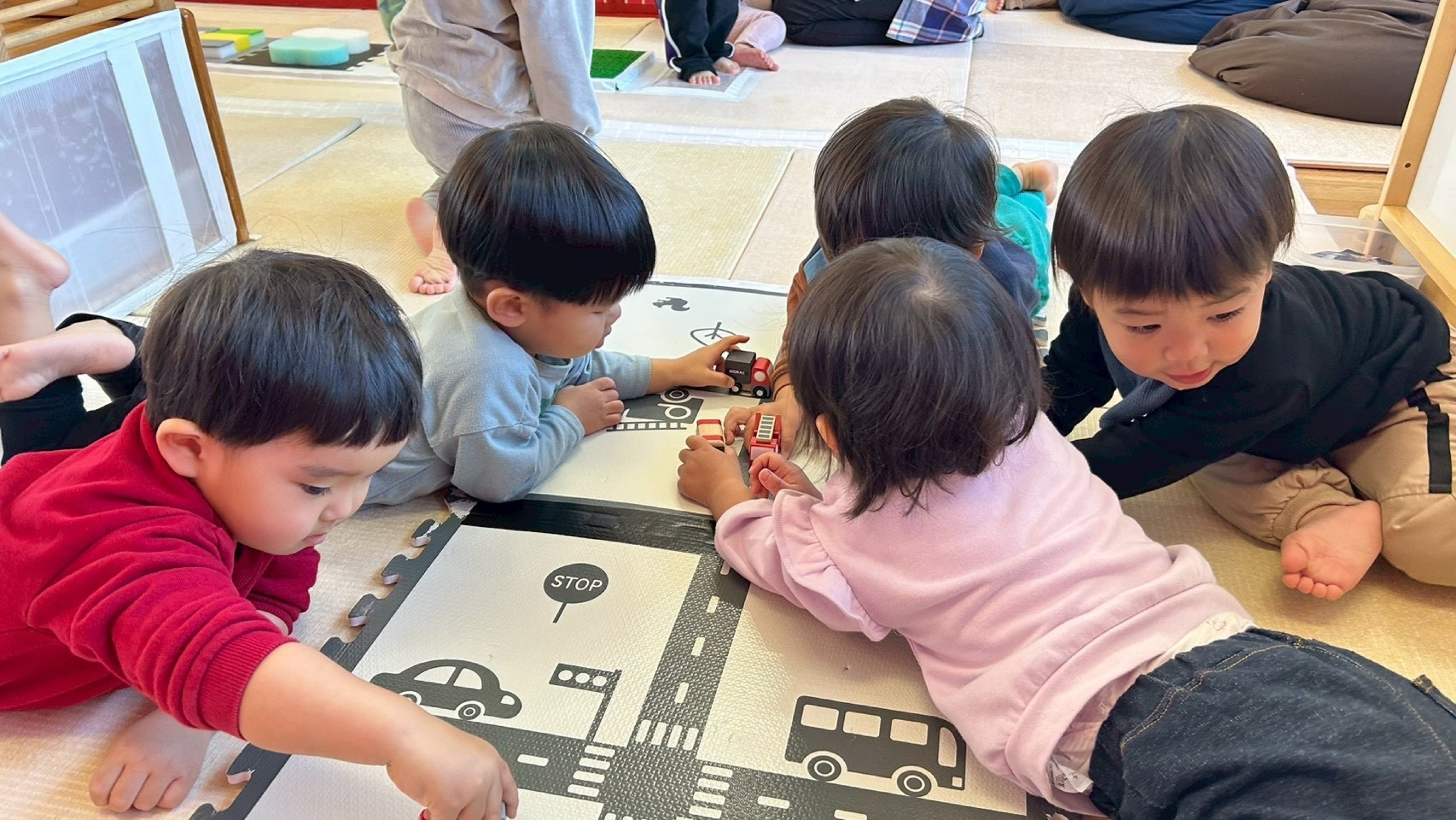 ③みんなが大好きなはたらくくるまのおもちゃで遊んでいる様子です。消防車や救急車のサイレンを鳴らしながら走らせ、輪になり仲良く遊んでいます♪