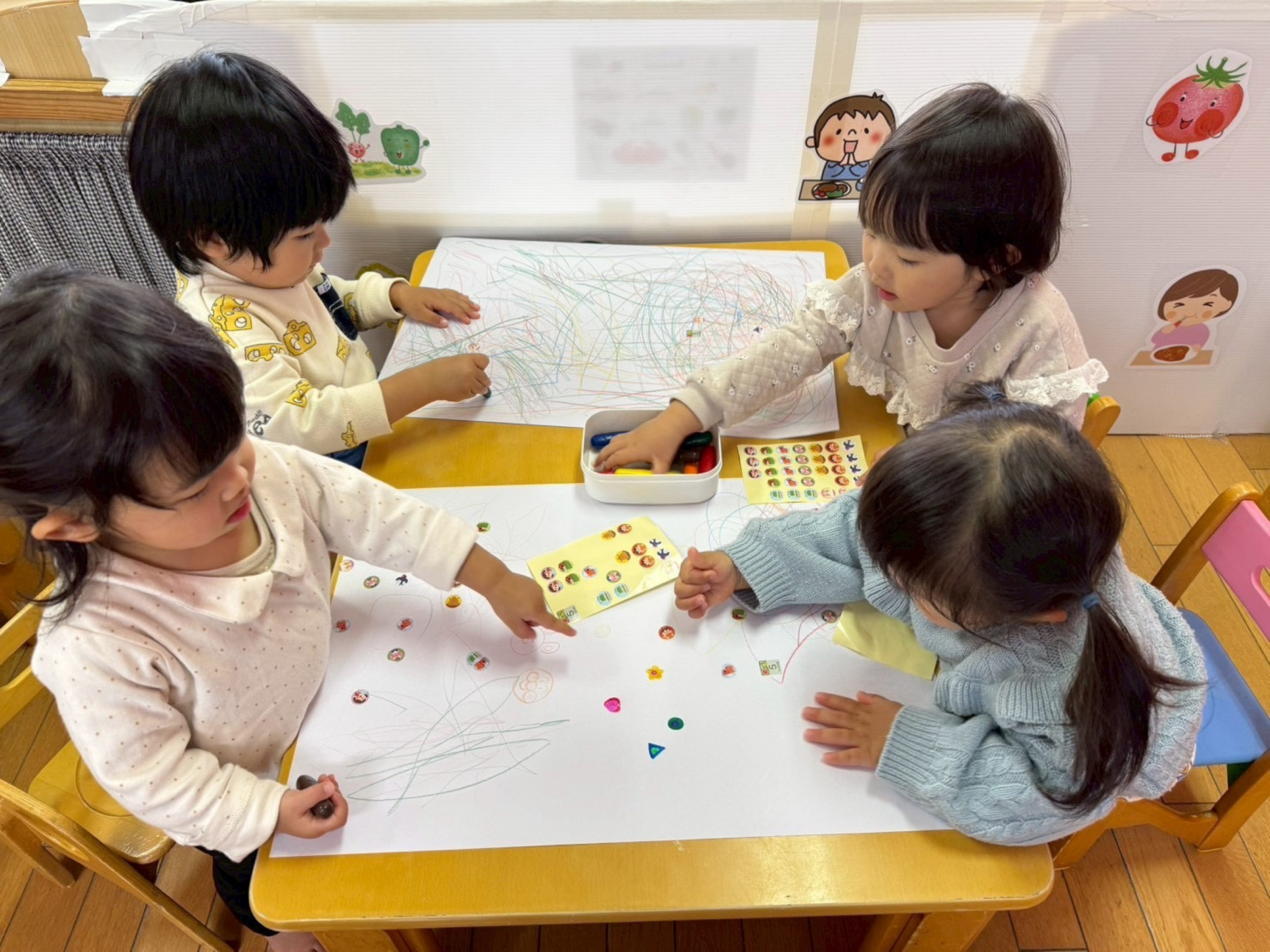 ⑤シール貼りやお絵描きなど机上での遊びも楽しんでいます。上手にできるかな~?
