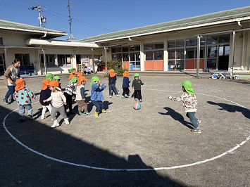 集団遊びにも挑戦しています!ボールを爆弾に見立てて転がってくるボールから一生懸命逃げたりお友達めがけてボールを転がしたりして楽しんでいます。