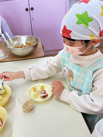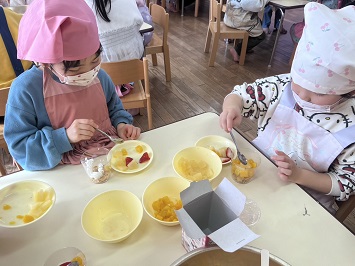 フルーツの数をグループのみんなで均等に分けられるように話し合ったり、声を掛けながら楽しんで作ることができました。自分で作ったパフェを美味しそうに食べる笑顔が印象的です。