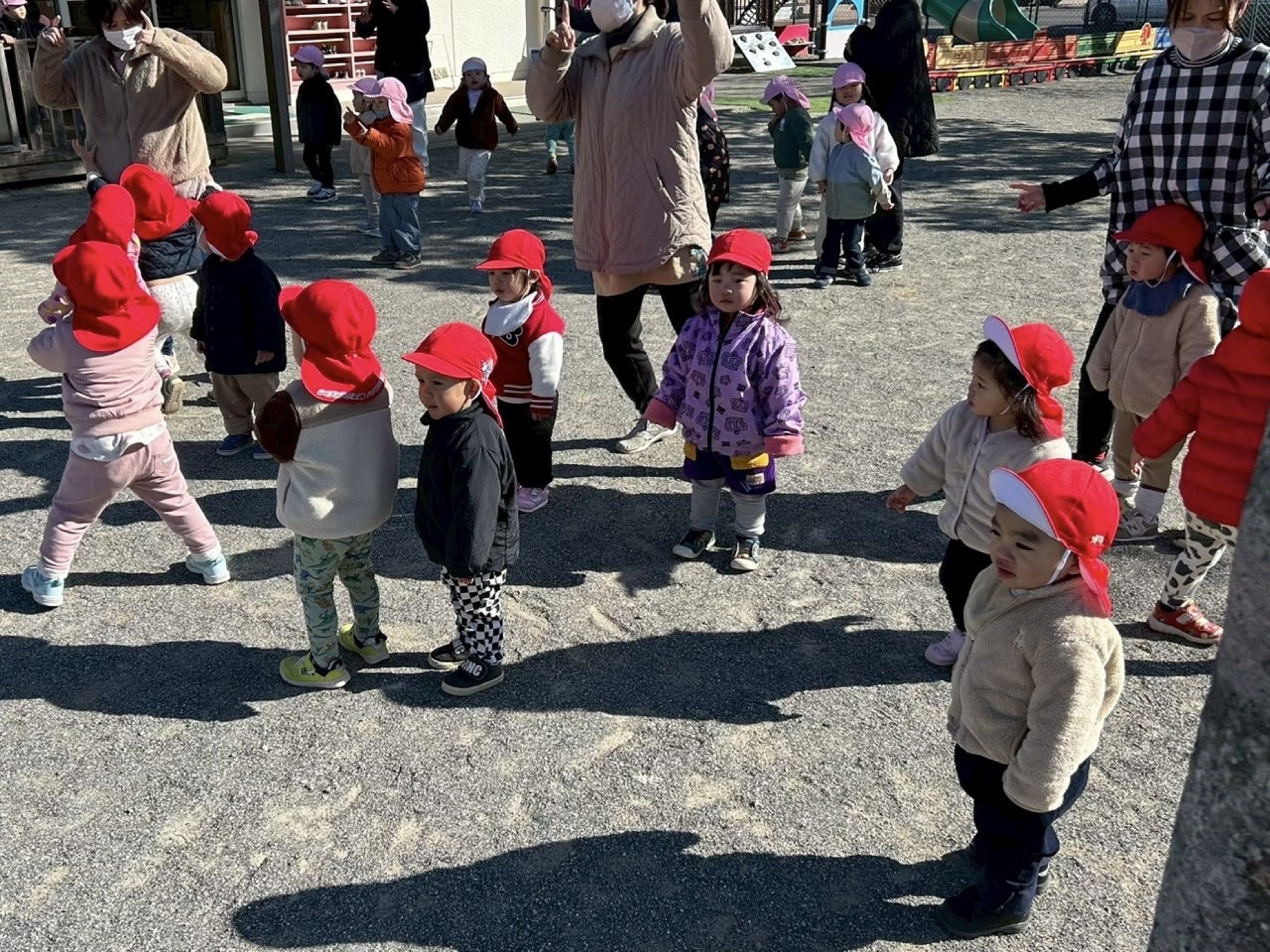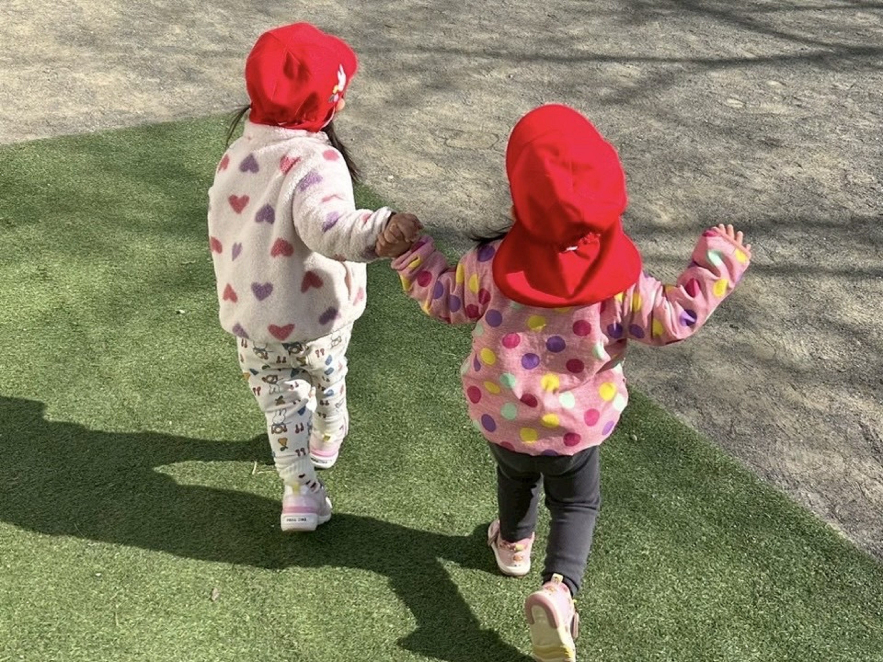 外遊びの準備を終え、園庭に向かう様子です。「おてて~‼」とお友達と手を繋いでニコニコ楽しそうです☻