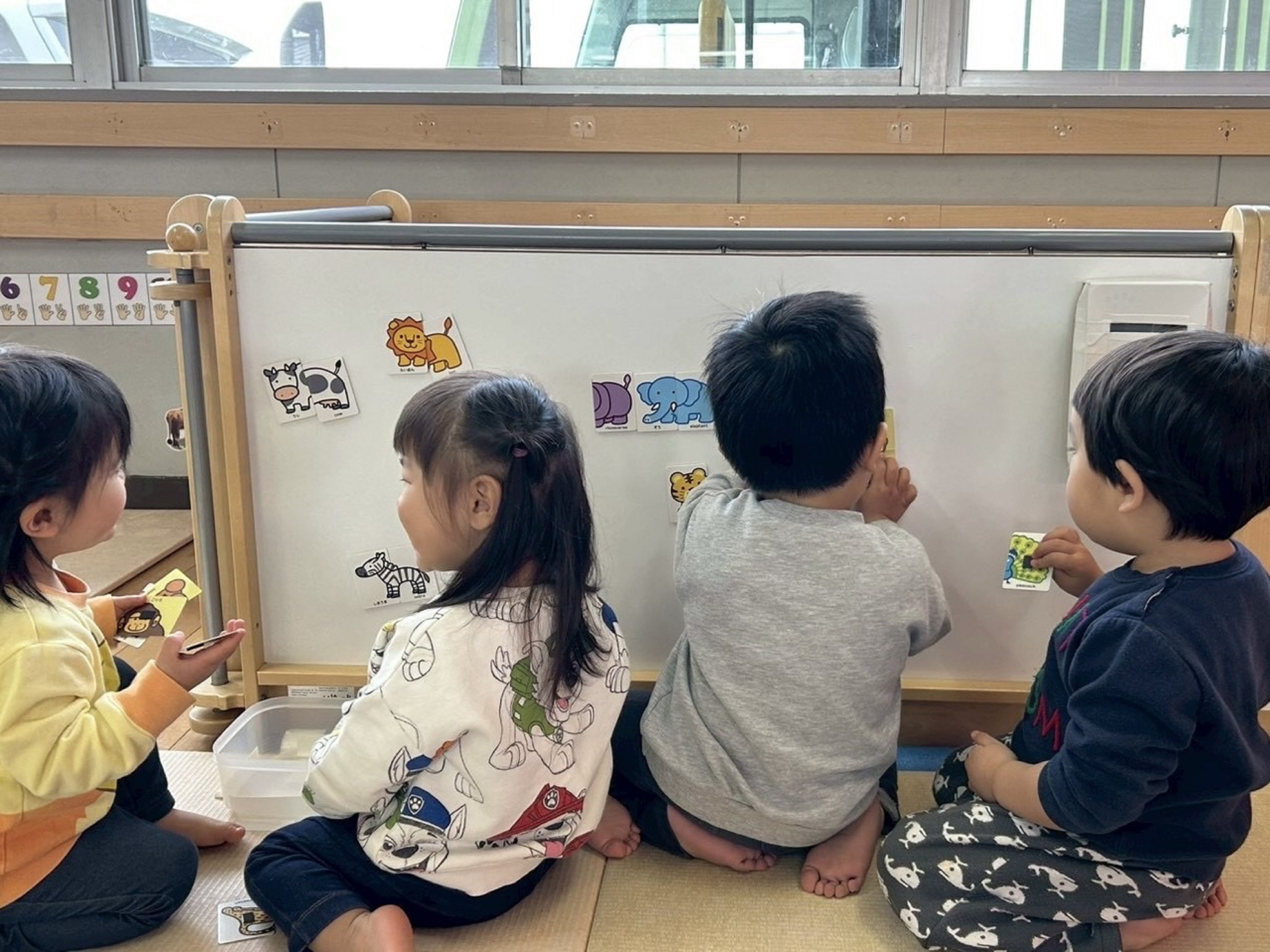 お友達と一緒に「こっち?」「次はライオンさん~」と絵合わせカードをする様子です。カードの絵がぴったり合わさると、嬉しそうな表情が見られます。