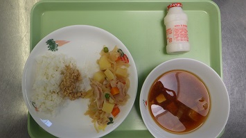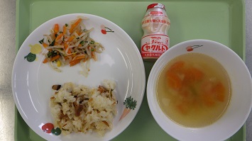 10月08日(水) 親子丼 味噌汁 春雨サラダ アシドミルク 10月07日(火) きのこカレーライス ハムとキャベツのサラダ コアコアいちご 型抜きチーズ 10月06日(月) ごはん 納豆 味噌汁 肉じゃが ラブミープラス 10月03日(金) 鮭ご飯 豆腐のすまし汁 里芋と竹輪の味噌煮 お月見ゼリー 10月02日(木) ロールパン ミートスパゲティー コーンスープ コアコア 10月01日(水) 中華風混ぜご飯 中華スープ もやしのごま和え ヤクルト