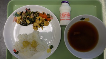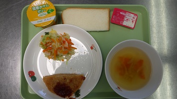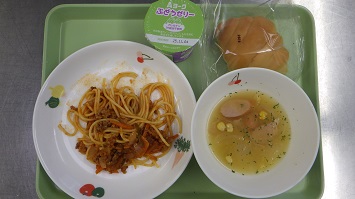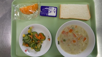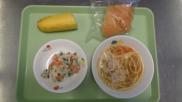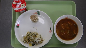 10月17日(金) 栗ご飯 味噌汁 小松菜とベーコンの卵炒め コアコアのむヨーグルト 10月16日(木) ロールパン ミートスパゲティ コーンスープ ぶどうゼリー 10月15日(水) 食パン(ブルーベリー&マーガリン) 大豆入りシチュー きゅうりとコーンのサラダ オレンジ 10月14日(火) 小松菜混ぜご飯 豚汁 蒸し焼売 りんごゼリー 10月10日(金) 食パン(いちごジャム&マーガリン) 野菜スープ ハムカツ・ケチャップソース 茹で野菜 みかんゼリー 10月09日(木) 中華そば ロールパン れんこんとツナのサラダ バナナ