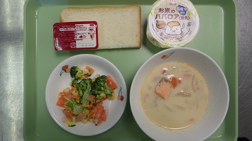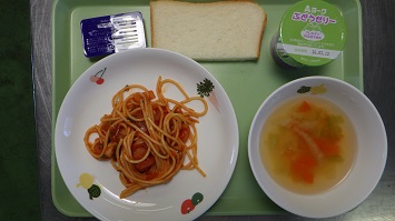 02月20日(金) ごはん 春雨スープ おからサラダ 揚げシュウマイ ヤクルト 02月19日(木) 食パン(ブルーベリー&マーガリン) イタリアンスパゲティ 野菜スープ ぶどうゼリー 02月18日(水) 冬野菜カレーライス キャベツとじゃこの酢和え りんご 02月17日(火) 食パン(メープル&マーガリン) サーモン豆乳シチュー ブロッコリーのサラダ お米のババロア 02月16日(月) 親子丼 味噌汁 白菜の塩昆布和え ジョア