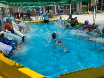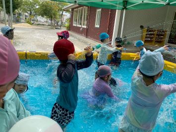 水遊びにもずいぶん慣れ、ダイナミックに遊ぶ姿がぐ~んと増えています。水鉄砲をつなげて水の流れを観察するお友達もいました。子ども達の発想に驚かされる毎日です☆