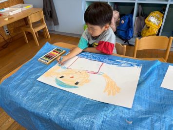 クレヨンや絵の具を使って大きな紙に夏の思い出の絵をかきました。「野菜を育てたね。」「プールも楽しかったよ!」と思い出しながら描いていましたよ。