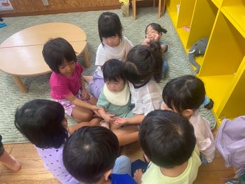 子ども達が真剣に読んでいるのは、8月の月刊絵本です。大好きなシールのページでは「どこに貼ろうかな?」とお友達と相談しながら考える姿がたくさん見られました♪