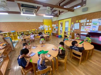 折り紙でバッタを作りました。折り紙の端と端を重ね、「アイロン、アイロン!」と言いながら人差し指で丁寧に折り目をつけていました。真剣な姿がとても素敵ですね!
