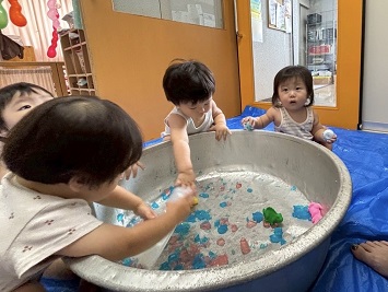 2025年09月19日(金) 9月の様子✿そら組 ①ぽっとん落としがブーム中です。何度も繰り返し楽しんでいます。 ②風船が風で揺れているのを不思議そうに見ています。 ③手作りウォーターマットが大人気です! ④色付き寒天に触れて遊びました。ぎゅっと握ったりツンツンと触れたりして感触を楽しみました。 ⑤手作りのシールにみんな興味津々です。 ⑥靴を履いて歩けるようになってとても嬉しそうです。 もどる
