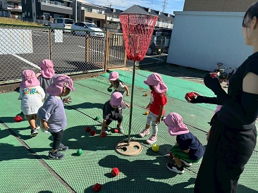 友達や保育教諭と踊ったり、走ったり、投げたりと様々な動作を楽しみながら、注目されることやできたことの喜びや嬉しさを感じ、キラキラした表情が溢れています。