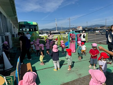 命を守る訓練で消防士さんに会え、消防車を間近で見られて大興奮!じっくり観察する中で消火器やホースを発見!あれはなに?と疑問を持ったり、興味津々でした。