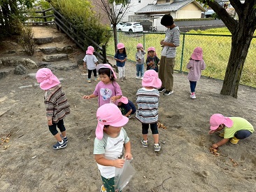 木の下にドングリを発見!!上を見上げて気にドングリがなっていることに気付いたり、葉の色の変化を楽しむ子ども達。見つけた!あった!とお散歩バッグに木の実や葉っぱを夢中になって拾い集め、秋の自然に触れ楽しんでいます。