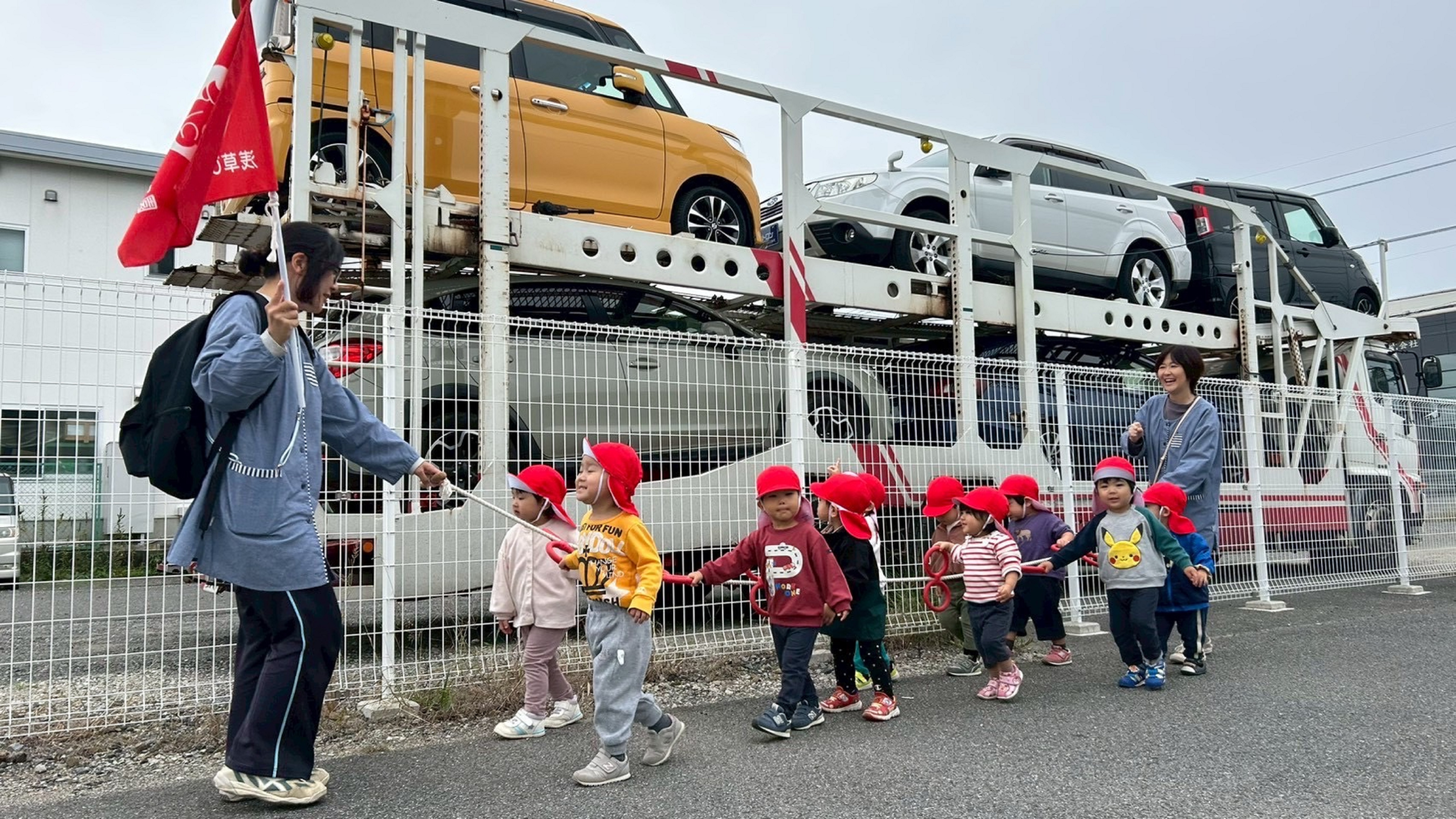 ①②いつもの散歩より少し遠くまで歩き、はたらく車を見に行きました。「うぃーん、がしゃん!」とショベルカーの音を真似したり、「キャリアカーだー‼」と近くで見るはたらくくるまに大興奮のあか組さんでした。