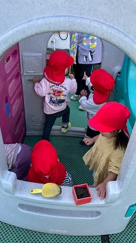 ④「ピンポーン」とボタンを押したり、鍵を開ける真似をしたり。トイハウスでのごっこ遊びもよく見られるようになりました。