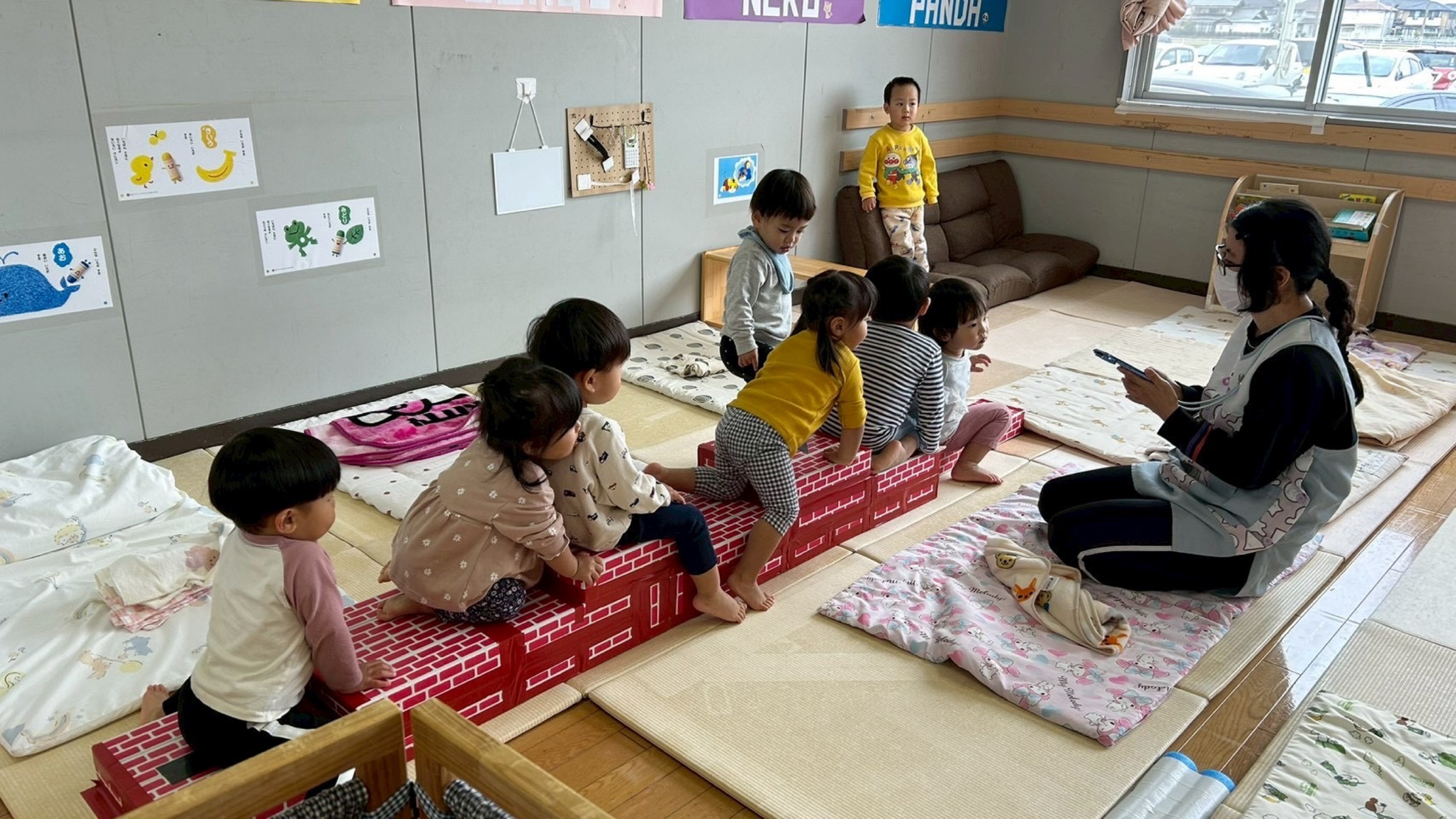 ③みんなが大好きなはたらくくるまのおもちゃで遊んでいる様子です。消防車や救急車のサイレンを鳴らしながら走らせ、輪になり仲良く遊んでいます♪