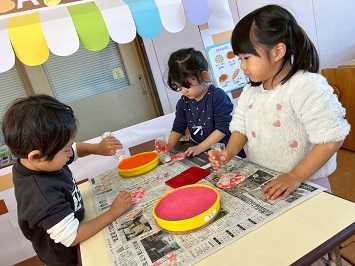 スタンプを押したりシールを貼ったりして年賀状を作りました。「いつお家に届くかな~?」と子ども達も年賀状が家に届くのを楽しみにしています。