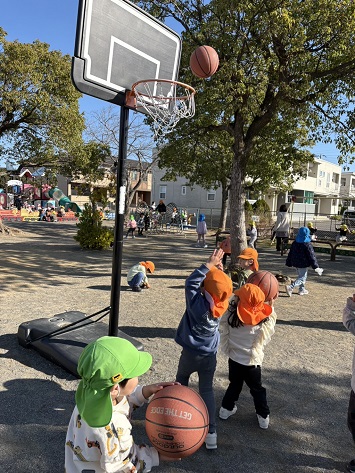 子ども達の背よりもはるかに高いゴールめがけてシュート!!シュートが決まると「先生みて!できたよ!」ととても嬉しそうに教えてくれます
