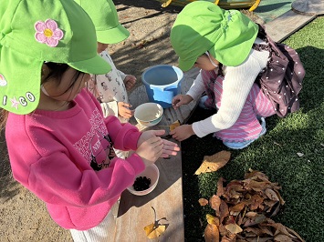 園庭に落ちている木の実や落ち葉を集めてお料理をしています。美味しいご飯が完成したらみんなでパーティーが始まり、「おいしいね」と言いながらご飯を食べる姿が見られます。