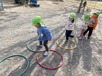 フラフープで遊ぶことが大好きな子ども達!電車ごっこをしたりけんけんぱをしたりいろんな遊び方で楽しんでいます