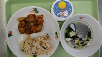 10月08日(水) 親子丼 味噌汁 春雨サラダ アシドミルク 10月07日(火) きのこカレーライス ハムとキャベツのサラダ コアコアいちご 型抜きチーズ 10月06日(月) ごはん 納豆 味噌汁 肉じゃが ラブミープラス 10月03日(金) 鮭ご飯 豆腐のすまし汁 里芋と竹輪の味噌煮 お月見ゼリー 10月02日(木) ロールパン ミートスパゲティー コーンスープ コアコア 10月01日(水) 中華風混ぜご飯 中華スープ もやしのごま和え ヤクルト